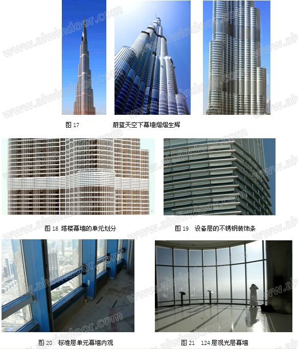 哈利法塔的高度為828m,建筑幕墻總面積為13.5萬m2,其中塔樓部分為12萬m2。在塔樓幕墻中,玻璃10.5萬m2,不銹鋼板1.5萬m2。采用單元式明框幕墻,共有23566個單元板塊。