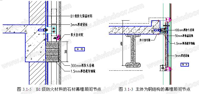 4)有實體墻的金屬與石材幕墻的保溫材料應采用不燃材料作防護層。防護層應將保溫材料完全覆蓋。防護層厚度不應小于3mm可采用玻鎂防火板、水泥板、鍍鋅鋼板或憎水型A級保溫砂漿,同時應按表3.1在每層設防煙封堵。防火保護層可采用玻鎂防火板、水泥板、鍍鋅鋼板或憎水型A級保溫砂漿。