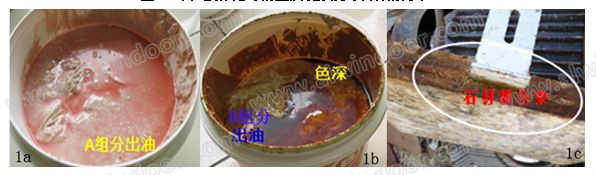 存儲性能的比較 一般說來,干掛膠產品標稱的有效期為1-2年。用戶通常不會存放很久后才使用。但在個別極端存儲條件下,比如產品暴露在夏季陽光下或存放在通風不好的高溫環境中,往往會造成膠組分里的油性物質跟固體填料發生相分離,分離出的油性物質在膠體表層析出,即所謂的出油。這一現象在干掛膠的B組分中較為常見。析出物質往往揮發性強、氣味重、色彩深,非常影響用戶的使用感受。若用戶使用前沒有預先調勻,很容易造成石材局部污染(見圖1c)。我們考察的三個品牌的產品在相同條件下(30oC,相對濕度50%)存放30天后發現:品牌A和品牌B產品皆有不同程度的出油(見圖1a-1b),而GM602固/液相相容性好,耐受力強,未發生明顯出油,且刺激性氣味小。