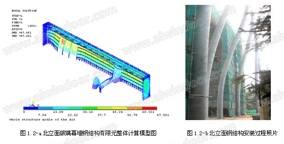 在建筑物北立面幕墻與東、西立面幕墻的銜接過渡處的弧形面是由兩段不同半徑的弧面銜接過渡,避免通常情況下的直角銜接;在北立面玻璃幕墻的西側,局部為凹球型玻璃表面,而球面與平面銜接處為順滑過渡的空間三維曲面。其設計、加工及安裝難度,迄今為止均為國內幕墻業(yè)所不多見。整個建筑物線條流暢合理,與周圍建筑物益顯和諧。(如圖1.1-b、c)