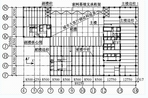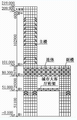裙樓為8層,主要為商業、娛樂、餐飲等,屋面標高51.0m;主樓和副樓在層1~8與裙樓連接為一個整體,8層以上均為高級寫字樓;副樓20層,屋面標高101.0m;主樓46層,大屋面標高209.9m。主、副樓在層16~20(共5層)通過鋼結構連接為一個整體,連接體跨度為42.5m,立面呈“h”形,結構立面圖見圖2。