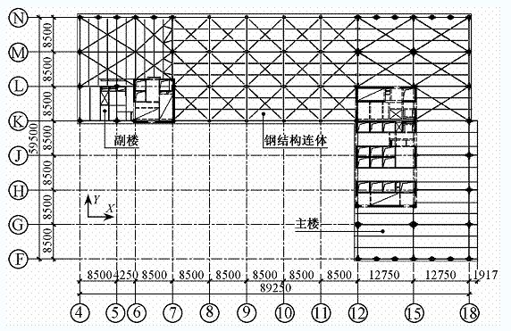 主樓與副樓在層16~20由鋼結構連接體相連(圖8),跨度為42.5m,寬度為25.5m,高度為20.7m。