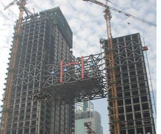 工程主體結構的特點是:1)兩棟塔樓核心筒嚴重偏置,扭轉較嚴重;2)兩棟塔樓高度、質量相差很大,且連接體與高塔的一端端部(而非中部)相連,屬嚴重不對稱連體高層;3)連接體跨度大,達42.5m,共有5層,結構質量大。