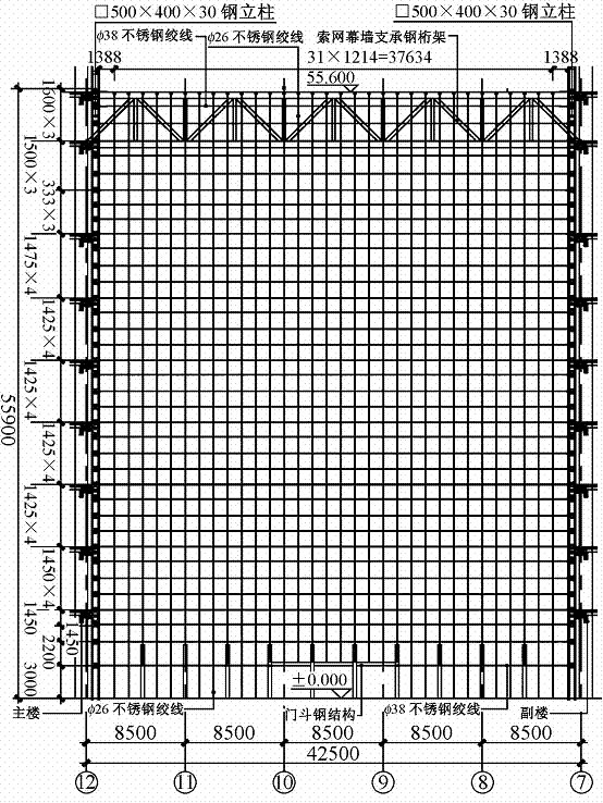 建筑北立面大廳的單層雙向索網玻璃幕墻(圖12),寬42.5m,高55.9m,與主、副、裙樓形成四面圍合的“城市大客廳”。水平索為主受力索,其左右節點通過轉換鋼立柱與主、副樓主體結構相連;豎索為次受力索,其下部與地下室頂板相連,上部與城市大客廳屋蓋鋼桁架相連。鋼立柱與主體結構之間采用銷軸支座連接,各層鋼立柱間采用套筒連接。