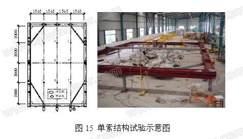 預拉力單層索網結構是本工程的關鍵性結構,加工制作要求高,單根拉索的張拉工藝與施工方法較為復雜。其力學性能、單索的張拉工藝、設計中計算參數的取值及節點構造措施等均有賴于試驗驗證。本次試驗在深圳三鑫公司索結構試驗中心進行,試驗檢測由廣東省建筑幕墻質量檢測中心負責。