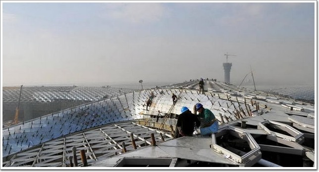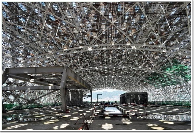 后來施工時,首先他們平整了這塊土地,因為這塊地之前是水,把它填起來之后進行了平整,做出這樣一塊場地。我不希望它有太多柱子結構,而希望它是一個一體的流線型結構。