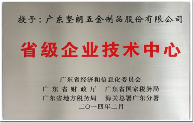 2014年3月6日,廣東堅朗五金制品股份有限公司被認定為第十四批廣東省級企業技術中心。本次認定充分肯定了堅朗公司在人才引進與培養,研發創新、技術革新等方面的綜合實力和競爭優勢,體現了公司在建筑五金(詞條“建筑五金”由行業大百科提供)領域的專注精神和專業能力。