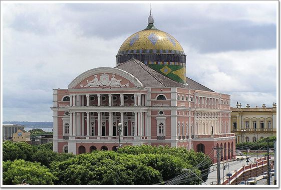 亞馬遜劇院位于亞馬遜雨林的中心城市瑪瑙斯。劇院建造的年代,正值使用世界各地材料進行橡膠貿易的鼎盛時期:巴黎家具,意大利大理石,英國鋼鐵。劇院外,其圓形屋頂由巴西國旗顏色描繪的36000塊裝飾瓷磚覆蓋。1897年,劇院以上演《喬康達》開幕。然而,隨著橡膠貿易的衰退,瑪瑙斯收入的減少,劇院很快關閉了。在2001年劇院重新開業前,該劇院已有90年沒有上演過歌劇了。