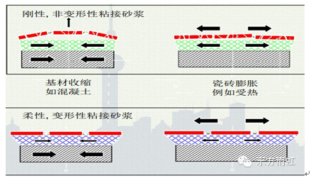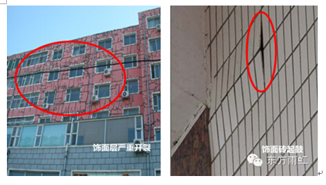 (2)對應力的產生及釋放考慮不充分,使用柔性不足的粘結砂漿,無法充分分散各層材料因彈性模量不同所產生的內應力,導致粘結層熱脹冷縮。加之飾面系統選擇錯誤,保溫層做法及抗裂做法在選材及工藝上均受“剛性防裂技術路線”的影響,采用的材料為預應力、高強、高彈性模量的材料,沒有留給溫度應力充分釋放的空間。并且,罩面層選用高彈透氣性差的彈性涂料,又未設置變形縫,因系統的連續面過長、累積變形過大而導致飾面層起鼓、剝落。