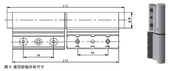 2.4 液壓鉸鏈的安裝、使用和調節鉸鏈的安裝與普通平開門鉸鏈安裝類似,直接用螺釘將合頁與預裝的壓板連接。此鉸鏈分左右,安裝時需分清左右方向。鉸鏈安裝位置距離門的頂端下,底端上200mm 的位置為宜(見圖9 鉸鏈外形尺寸)。為方便安裝,在扇活頁位置設有內六角緊定螺釘,它的作用就是起到扭簧的離合功能。在拆卸這只螺釘前合頁的扭簧功能處于失效狀態,框扇活頁可以隨便轉動。安裝時需注意尾部帶調節螺釘及調節標識的一端為框活頁必須裝在下方。裝好后試開門扇確保無阻礙和噪音,然后將門開到90° -180°范圍內,用內六角扳手將內六角緊定螺釘拆下。當門扇完成一次關閉過程時扭簧閉門器功能即可開啟。最后通過調節調速螺栓可控制門扇關閉所需時間。