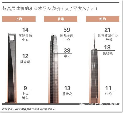 調(diào)研的數(shù)據(jù)顯示,超高層辦公樓的租金回報(bào)高于周邊項(xiàng)目。目前,香港國際金融中心(IFC) 的租金達(dá)到59元/平方米/天,相比核心商圈的中環(huán),租金高出55%;而上海和紐約的超高層建筑相對于所處商圈的租金則高出17%。