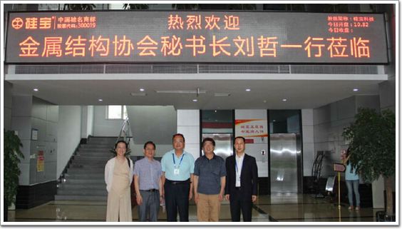 2014年6月12日,中國建筑金屬結構協會秘書長劉哲一行蒞臨硅寶,調研考察硅寶科技生產經營狀況。硅寶科技董事長王躍林、市場總監王有強對其進行了熱情的接待,并帶領他們參觀了全球最先進的智能化立式生產線。