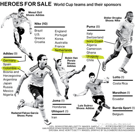 然而值得注意的是,兩位品牌大佬相互搏殺時,PUMA已從身后慢慢追上。今年的世界杯上,意大利、瑞典、科特迪瓦、阿爾及利亞、喀麥隆、加納、烏拉圭、智利共八支國家隊將身披PUMA戰衣。這股新勢力勢必會在世界杯上刮起一陣旋風。