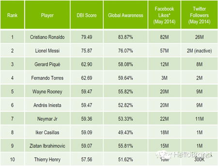 耐克贊助的葡萄牙人克·羅納爾多(C羅)以86%的全球知名度領銜該排行榜。而2013年一年印有他名字的球衣就賣了超過100萬件。阿迪贊助的梅西的全球知名度為76%,位居第二。 Repucom認為,C羅在社交網絡上的活躍有助于提升其市場價值。C羅在推特(Twitter)上已經有2600萬粉絲,而“寡言的”梅西則只有200萬追隨者。