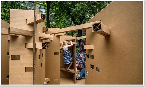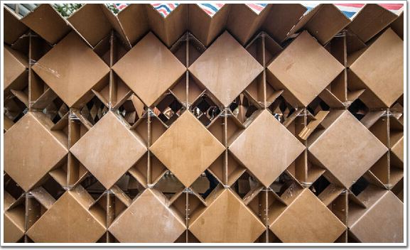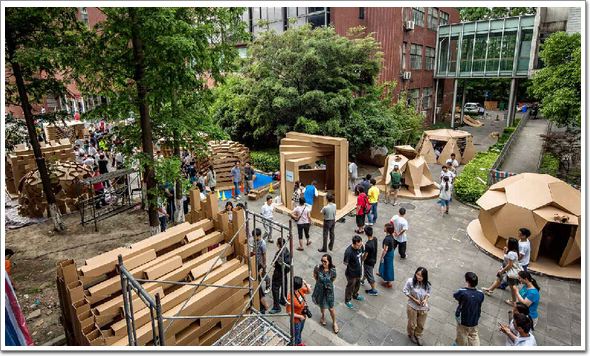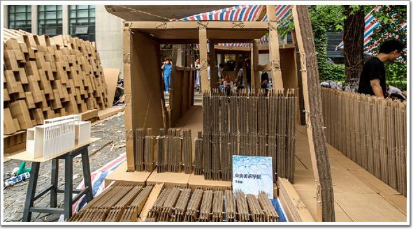 這是五個大一女生組成的團隊。設計充分發揮了紙板的特點,采用極為簡單的方式,塑造出極富變化的空間和光影效果。