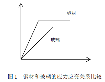 玻璃在低溫和常溫下基本是理想的彈性體,遵循胡克定律,玻璃的彈性模量為(44.1~88.2)×10的9次方,泊松比為0.2。玻璃在拉伸狀態下的應力(詞條“應力”由行業大百科提供)應變曲線與鋼材不同,鋼材在達到彈性極限之前,應力應變基本呈直線關系,在達到彈性極限之后,在應力基本沒有變化的情況下,應變會迅速增加,應力應變呈非線性關系。玻璃應力應變呈線性關系,沒有明顯的屈服,是理想的彈脆性材料。鋼材與玻璃的應力應變拉伸曲線如圖1所示。