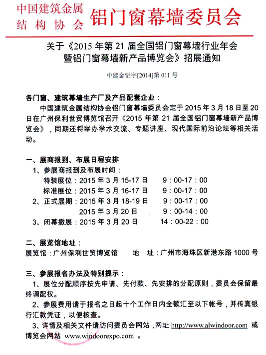 中國(guó)建筑金屬結(jié)構(gòu)協(xié)會(huì)鋁門窗幕墻委員會(huì)定于2015年3月18日至20日在廣州保利世貿(mào)博覽館召開(kāi)2015年全國(guó)鋁門窗幕墻行業(yè)年會(huì)暨鋁門窗幕墻新產(chǎn)品博覽會(huì)。