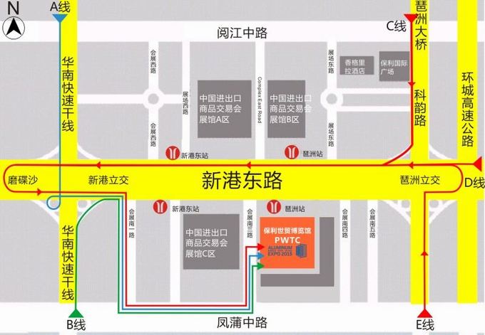 A、華南快速(新港東會展中心出口)→新港東路→保利展館門窗幕墻展。