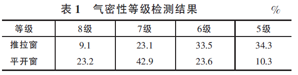(1)推拉窗生產工藝簡單,安裝方便,已被廣泛采用;但氣密性能較差,而平開窗和固定窗的防空氣滲漏效果優越得多(表1),從表1中可看出推拉窗不合格率在34.3%,而平開窗不合格率在10.3%。推拉窗由于沿窗框下滑軌來回滑動,上部有較大空間,下部有滑輪間的空隙,窗扇上下易形成明顯的空氣對流交換,熱冷空氣的對流形成較大的熱損失,因此無論采用何種隔熱型材做窗框,通過氣密達到的節能效果平平。