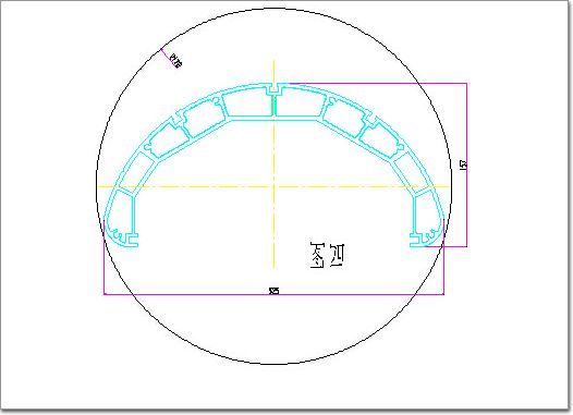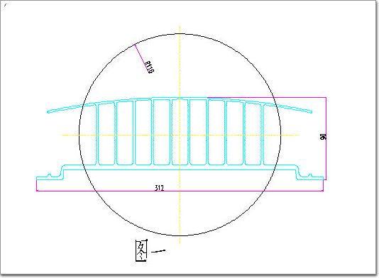 難點分析:該型材幾何尺寸較大(如圖4),客戶對圓弧部分精度要求較高。各個空腔以及螺絲孔均有嚴格裝配要求,同時,由于該型材包含10個小空腔,左右兩側最邊緣的空腔已經處于模具最大進料孔的邊緣,因此模芯的受力難以平衡,極易發生嚴重偏壁影響成型,甚至發生模芯斷裂。該型材如果在7000噸擠壓機(擠壓筒直徑400以上)上生產的話,難度不大,但是由于受到設備條件制約,5000噸擠壓機的擠壓筒偏小,生產難度較大。該型材兩邊遠離擠壓中心的位置供料較為困難,出料以后由于流速不均,容易造成圓弧部分變形,難以滿足客戶對圓弧曲線精度的要求。同時,由于模具橋位跨度大,使模具橋位的抗彎強度(詞條“抗彎強度”由行業大百科提供)大大下降,在生產過程中,當模具承受較大擠壓載荷時,橋位的變形撓度較大,在橋位水滴處形成拉應力,造成模芯變形,甚至裂橋報廢。
