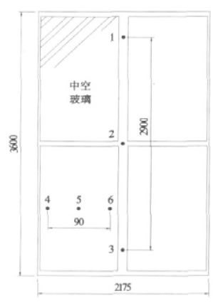 在抗風壓性能試驗中,分別在中空玻璃面板中線和玻璃幕墻試件中線處布置了2組測點。在相應的測點處安裝數碼位移計,位移計安裝在中空玻璃面板和玻璃幕墻的外側。用來測定在不同的壓力差作用下,玻璃面板和玻璃幕墻試件的撓度的變化規律。玻璃面板和幕墻的面法線撓度測點布置情況如圖1所示。