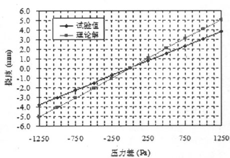 中空玻璃中心點處的撓度的理論解和試驗結果如圖4所示。由圖4可知,理論結果和試驗結果具有相同的變化規律,其撓度均隨著壓力差的增大而近似呈線性增加。當壓力差為1250Pa時,理論方法計算玻璃中心點處的最大撓度為5.05mm,而相應的壓力差荷載作用下,試驗測得的中心點處最大撓度為3.81mm。理論結果比相應條件下的試驗結果大25%。由此可知,現行的理論方法的計算結果偏于保守,利用該理論方法進行中空玻璃幕墻的設計是偏于安全的。