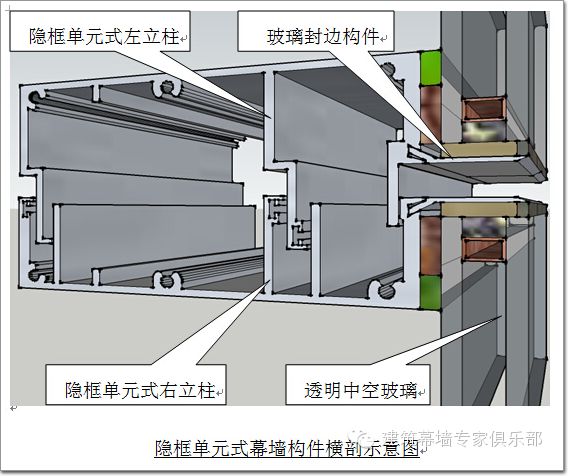 對于(圖4.1、4.2)明框的單元式建筑幕墻而言,因為在幕墻的外側已經設計出外漏金屬(詞條“金屬”由行業大百科提供)邊框,這些構造要求都已經存在。從外表面來看,他們起到一定的裝飾作用、滿足了建筑師的外觀效果要求;從安全構造來看,他們沿著所有板塊玻璃的周邊加以封邊,起到保護玻璃的作用。以上兩點綜合單元式幕墻從開始組裝生產到整個安裝的全過程,都加以對玻璃板塊給予保護,因為單元板塊無論是工廠組裝還是現場安裝,都需要經過幾次的搬運過程,這些過程如果措施不當,都將可能磕碰到玻璃板塊的邊部,所以明框效果的單元式幕墻一般是不會由于玻璃邊部受到外力磕碰而損壞。