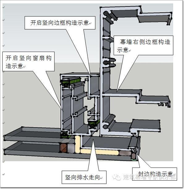 不知大家看上面的圖注意到沒有,這里的開啟扇構造與常規的開啟有部分區別,就是在開啟密封、排水構造上。在開啟上的上部采用隱蔽式密封EPDM膠條,阻止雨水的正常流入;在開啟扇邊框的構造上設計出一圈閉合的有組織水槽,因為我們考慮的在合理都是理論的,還要考慮超出理論的事情出現,所以水槽的構造上是閉合的,而且阻止水通過開啟扇而流入開啟窗內的;假如出現理論之外的事情,那么雨水也會沿著我給它們設計好的排水線路,從上進入——分別流入兩側豎向線路——沿著豎向進入下部,最后沿著下部扇的構造底部流出。