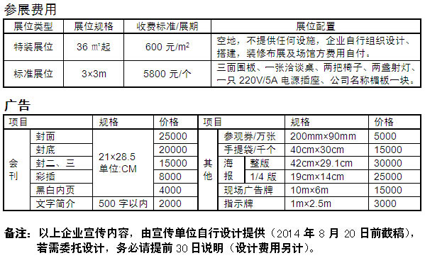 備注:以上企業宣傳內容,由宣傳單位自行設計提供(2014年8月20日前截稿),若需委托設計,務必請提前30日說明(設計費用另計)。
