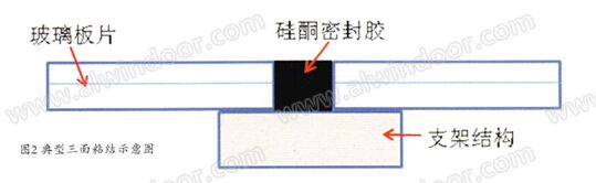 原因分析:經過實地調查,該采光頂漏水的主要原因是:1)該采光頂無規范的設計施工圖紙,施工隊直接采用993作為粘結材料把玻璃板片粘合在鋼支架結構上,同時填充玻璃板片間縫隙,是一個典型三面粘結(圖2),三面粘結會導致密封膠的位移能力顯著地降低,當受外界作用力時,密封膠的位移能力不能滿足接縫位移,從而引起開裂;2)施工隊缺乏筑幕墻施工經驗,施工工藝流程非常不嚴謹,玻璃板片和鋼架結構之間采用雙面膠條(詞條“膠條”由行業大百科提供)作為主要支撐材料,玻璃板片在鋼結構上放置隨意,導致板片接縫寬度不一,有的接縫可能只有2mm,這種接縫太小,不能體現出密封膠的位移能力,很容易在外力作用下開裂。