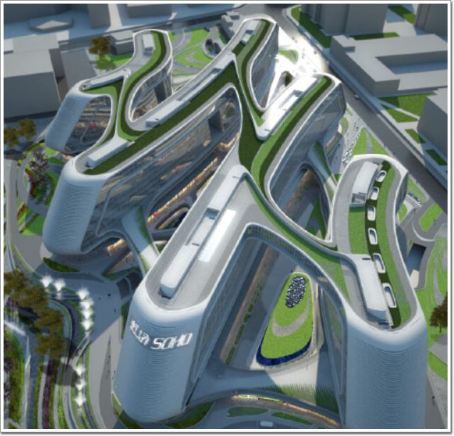 上海虹橋SOHO由扎哈•哈迪德建筑設計,該建筑采用了一些天空輪廓和外形的創新設計,仿若一條盤旋蛟龍,極富創新寓意和未來特征。塔樓主體采用現澆鋼筋混凝土框架-剪力墻結構體系,端部自由曲面(詞條“自由曲面”由行業大百科提供)造型為曲線鋼梁和鋼桁架,建成后將成為上海的新地標。