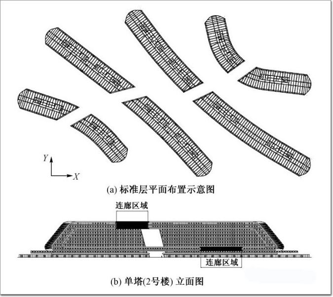 由西向東將4個塔樓分別命名為1~4號樓,見圖2。1~4號樓建筑縱向長度分別為155,269,302,165m,各塔樓橫向寬度均為25m,塔樓之間通過設在3層的1~3號連廊(各為一層層高)和設在10~11層的4~6號的連廊(各為兩層層高)相互聯系起來,形成大底盤超長多塔多連體的復雜結構。各塔樓兩端部為造型統一的火車頭形曲面,從2層挑空之后向上逐層收進。