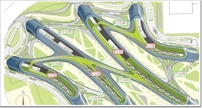 虹橋搜侯(SOHO)位于上海市長寧區臨空經濟園區,緊鄰外環路和虹橋機場。場地東西長約466m,南北長約260m,占地8.6萬m2,整個場地內均設有地下室,共有2層,主要功能為車庫、設備用房、影院和配套用房,地下2層部分設有人防區域。地上部分由4棟狹長彎曲的建筑單體穿過基地,劃分出3個庭院空間,庭院部分建筑植被覆土厚1.5m,并設有4個下沉廣場,各建筑單體均為11層,建筑總高度均為40m,主要為商業、辦公綜合性建筑。項目總建筑面積約35萬m2。建筑效果圖見圖1。