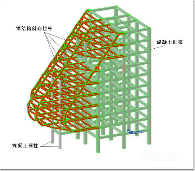 (4)其他措施:對于1層室內外高差錯層造成的短柱,采取箍筋全高加密等構造措施,對室內外交界處樓板加腋及設置大于高差的框架梁,并沿標高變化處布置大梁連接上下樓板;結構端部和中部與鋼梁連接的框架柱均布置為加勁混凝土斜柱。鋼結構區域樓板采用底部閉口的壓型鋼板與現澆鋼筋混凝土組成的組合樓板。