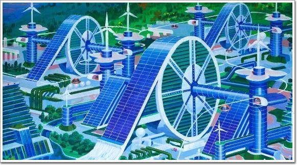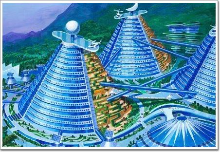 圖片中顯示的是朝鮮建筑師眼中未來世界的樣子,像是鋼筋和玻璃(詞條“玻璃”由行業(yè)大百科提供)構(gòu)成的山脈。