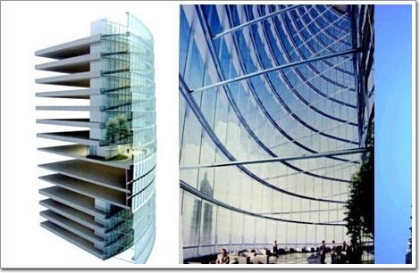 武漢國際金融中心,即武漢綠地中心,高度606m,125層。平面為圓角三叉形,豎向逐漸內收呈圓滑曲線(圖21)。立面上開有喇叭形洞口,可以減少主體結構和幕墻所受的風力(圖22)。