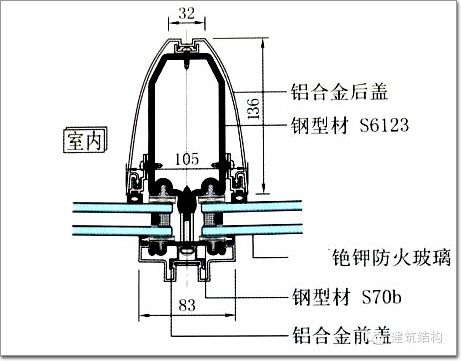 內幕墻為防火幕墻,采用(8mm超白+0.89mmSGP+8mm超白)+12A+8mm銫鉀防火玻璃(詞條“防火玻璃”由行業大百科提供)。支承結構(詞條“支承結構”由行業大百科提供)均采用冷彎薄壁型鋼,梁壁厚3mm,柱壁厚4mm。鋼結構(詞條“鋼結構”由行業大百科提供)外包鋁型材(詞條“型材”由行業大百科提供)(圖18~20)。