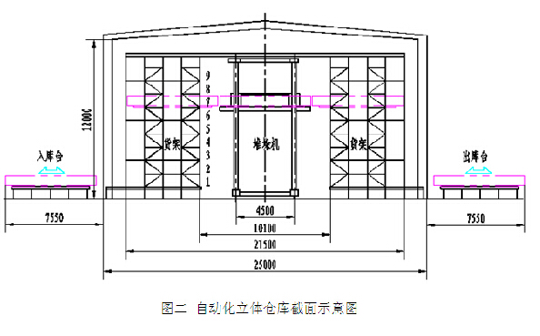 貨架是自動化立體倉庫的重要組成部分,它提供料筐和鋁型材自動存儲的空間。圖二是某鋁型材廠成品自動化立體倉庫的截面示意圖。