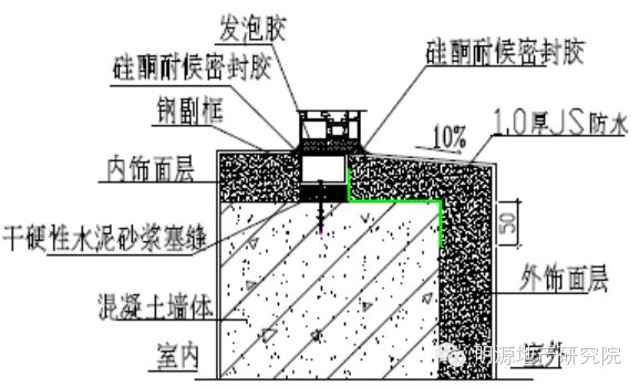 塞縫砂漿干燥(詞條“干燥”由行業(yè)大百科提供)后或發(fā)泡膠固化后,在洞口外側(cè)四周分多遍涂刷JS 防水,須保證其厚度不小于1.0m,防水必須壓門窗框不小于5mm 且涂刷到過門窗洞陽(yáng)角(詞條“陽(yáng)角”由行業(yè)大百科提供)50mm 處,詳見節(jié)點(diǎn)圖。