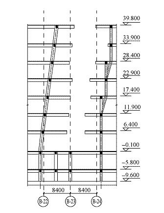 中庭兩側的柱子,一側(左側)柱子從2層向中庭方向傾斜直至屋頂,傾斜角度為8°,中庭邊線隨之變動;另一側(右側)柱子從4層開始,兩層一退臺,每次退臺1.5m,共退臺2次,即4,5層退臺1次,6,7層退臺1次(圖2,3)。西北和東南入口處均設置跨層大堂,形成穿層柱,局部穿層柱達4層高(23m高)。在西北立面處建筑有收進。