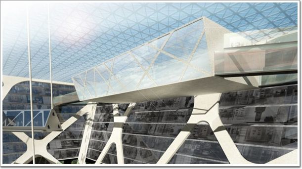在摩地大樓的規劃藍圖中,它擁有一個面積達775000平方米的玻璃“屋頂”,呈倒三角形的“大樓”中心是一個“天井”,讓自然光能從地面直達地底,“天井”周圍包圍著可利用的建筑空間。