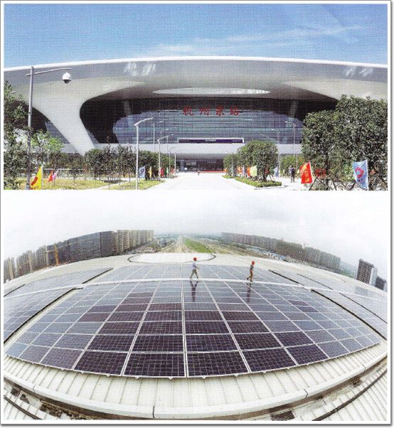 杭州東站——新時(shí)代的錢江潮,杭州東站是全國(guó)九大省會(huì)城市巨型車站建設(shè)工程的“收官之作”,該車站于2013年7月1日投入使用,總建筑面積這113萬(wàn)平米,它的光電建筑應(yīng)用類犁是建筑屋面和風(fēng)雨棚一體,既采用單晶硅電池叉有非晶硅薄膜電池,于2013年6月(光伏系統(tǒng))建成,裝機(jī)容量為10MWp,年發(fā)電量為10GWh。杭州火車東站車站站房設(shè)計(jì)以“錢江潮”為主題,以此體現(xiàn)出杭州“精致和諧、大氣開(kāi)放”的城幣形象和從“西湖時(shí)代”邁向“錢塘江”時(shí)代的時(shí)代特征。這座光電建筑,預(yù)計(jì)每年可發(fā)電近1000萬(wàn)度電,與相同發(fā)電量的火電廠相比,每年可節(jié)約標(biāo)煤約2769噸,還可相應(yīng)地減少燃煤所造成的二氧化硫55噸、氮氧化合物24噸、煙塵443噸、二氧化碳7108噸,按每天發(fā)電35萬(wàn)度電計(jì)算, “每天的發(fā)電量覆蓋整個(gè)東站每日的照明用電量綽綽有余”這也使得杭州火車東站成了“零碳排放建筑”。