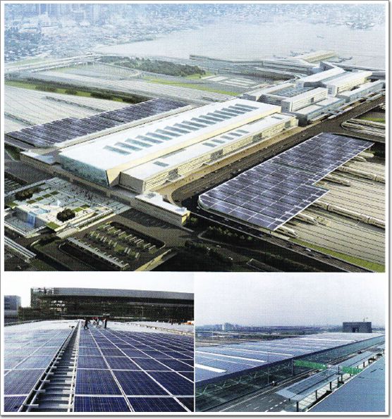 上海虹橋站——綠色鐵路建設(shè)中的東方之珠,上海虹橋站采用了綠色環(huán)保和建筑一體化的設(shè)計(jì)理念,將光伏組件與站臺(tái)風(fēng)雨棚建筑有機(jī)結(jié)合,安裝太陽(yáng)能電池板總計(jì)23910塊,鋪裝面積達(dá)到6.1萬(wàn)平方米,總裝機(jī)容量達(dá)到6688千瓦。車站采用風(fēng)雨棚的光伏應(yīng)用形式使用晶硅電池,于2010年7月建成,裝機(jī)功率為6688MWp,年發(fā)電量:63GWh。