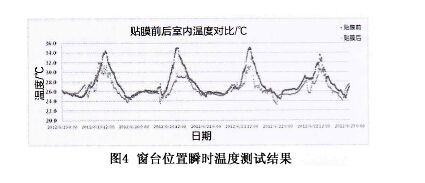 (3)采用3MT-Logger溫度記錄儀逐時(shí)跟蹤測(cè)試貼膜前后窗臺(tái)附近位置的溫度變化對(duì)比,記錄頻率為每5mn—次。