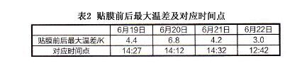 表2列出了6月19日~6月22日期間貼膜前后的最大溫差以及對(duì)應(yīng)的時(shí)間點(diǎn),除去6月22日的情況比較特殊可能由于天氣影響以外,其他3d的最大溫差時(shí)間均出現(xiàn)在下午14∶ 30左右,平均最大溫羞達(dá)到5.1K。