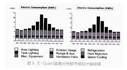 采用E-Quest能耗分析軟件對(duì)該建筑進(jìn)行建模并進(jìn)行能耗分析,結(jié)果如圖9所示。玻璃貼膜后,由于空調(diào)負(fù)荷的降低,年度用電從79390 kWh降低為70000kWh,降低幅度為們8%。