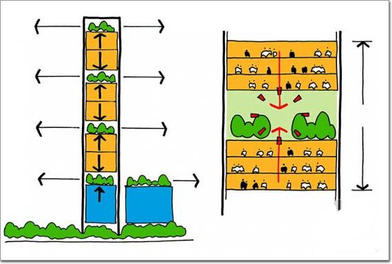 該建筑旨在促進(jìn)社區(qū)與員工之間的互動(dòng)。每九層設(shè)置空中花園,創(chuàng)建了塔樓內(nèi)部的室外空間,并提供了會(huì)議場所,提供壯觀的360度全景視野。室內(nèi)空間為幾何形狀布局,重新詮釋傳統(tǒng)布局的辦公空間,為用戶提供各種各樣的高效工作環(huán)境。