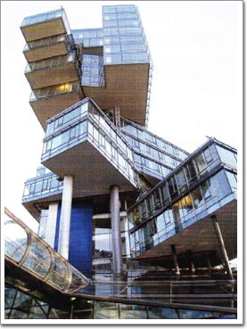 Nord LB Building,北德意志州銀行,位于德國漢諾威,是德國第四大州立銀行。房子由設計師Behnisch和他的搭檔設計,在2002年完工。從外觀看,它是一棟超現實積木建筑和傳統建筑的完美結合體,既有著令人心跳和耳日一新的大膽風格,又透著德國人傳統的、嚴謹的風韻。據說這樣設計的目的是為了減少碳排放,顯得更加環保—些。