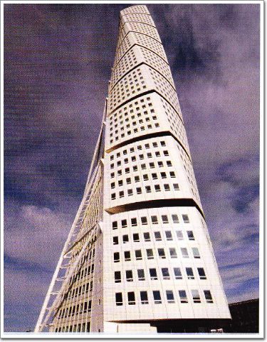 這幢奇異的建筑是由西班牙著名設計師圣地亞哥·卡拉特拉瓦(Santiago Calatrava)設計的,該設計超越了工程學的局限,贏得了很高的聲譽。扭轉大廈的樓體整個置90度順時針旋轉,可以說相當“非主流”。大廈高656英尺,是斯堪的納維亞半島上最高的建筑,10層以下是寫字間,10層以上是公寓。