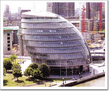 倫敦市政廳是英國首都最具有象征性的重要新建筑物之一,它的設計力求能夠表達國家民主制度實施過程的公開性,同時也顯示了作為—座公共建筑,它在整體上的可持續忤和保護環境不受污染的潛能。大樓的供暖和冷卻系統的能源消耗,僅相當于配各有典型的中央空氣調節系統的相同規模的辦公大樓的四分之一,是真正意義上的“綠色環保建筑”。建筑位于泰晤士河塔橋附近,毗鄰新倫敦新發展區,它提供了近18000平方米的可使用面積,容納了議會大廳,各部門辦公室和公共設施以及市長、議員、市政府工作人員的辦公室。